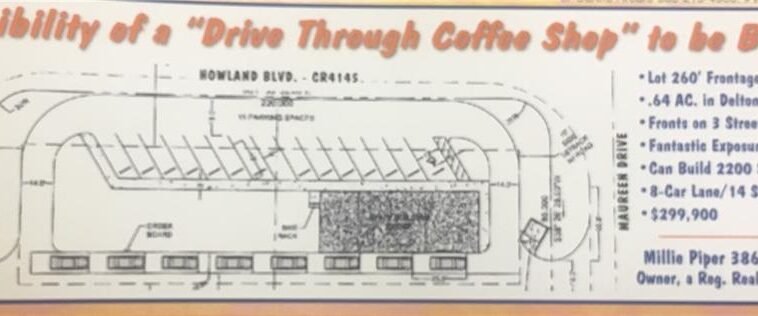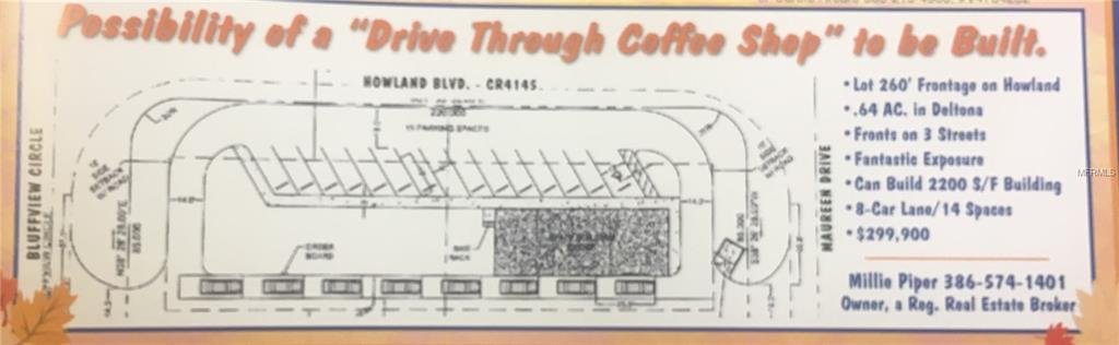 Make a left on to Bluffview drive across the back of the lots get you tacos then exit out onto Maureen Dr. this layout has been drawn up, with the setbacks, long narrow foot prints of the building and parking, 2,100 Sq. Ft building. 8 car holding lane and 12 parking spaces. Near Deltona’s Hospital on Howland and I4. Two corner lots. Ideal for retail/commercial locations. Across from Winn-Dixie. Near sewer and water. Great panoramic double corner exposure. Direct turning lane from Howland. Ideal for drive thru/fast food restaurant.